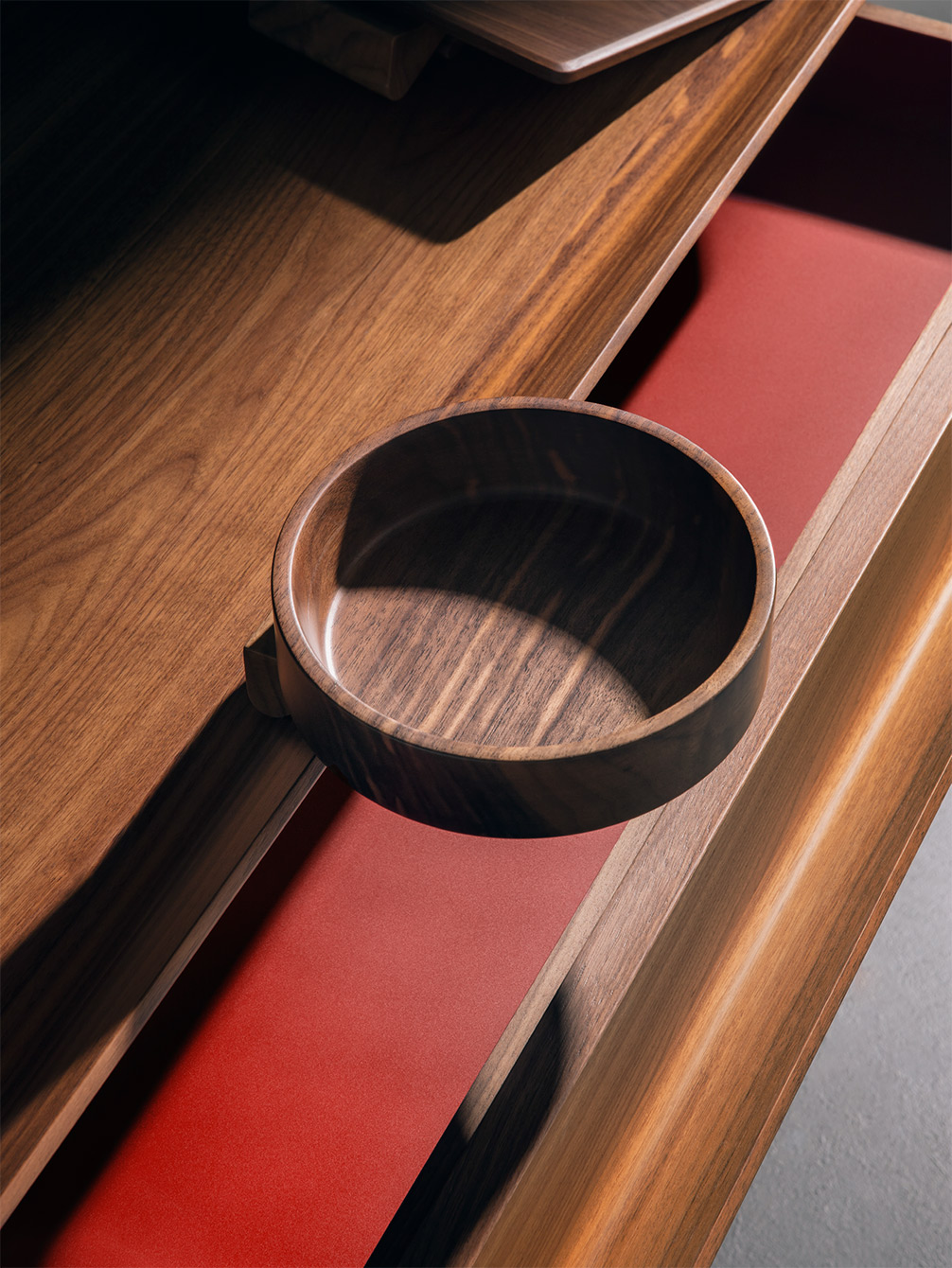 Overlooking is a family of drawers in solid walnut, which contemplates various container furniture, among which a double-height unit with 10 drawers, similar to a totem, a small chest of drawers that can be used as a bedside table and a wall desk unit.